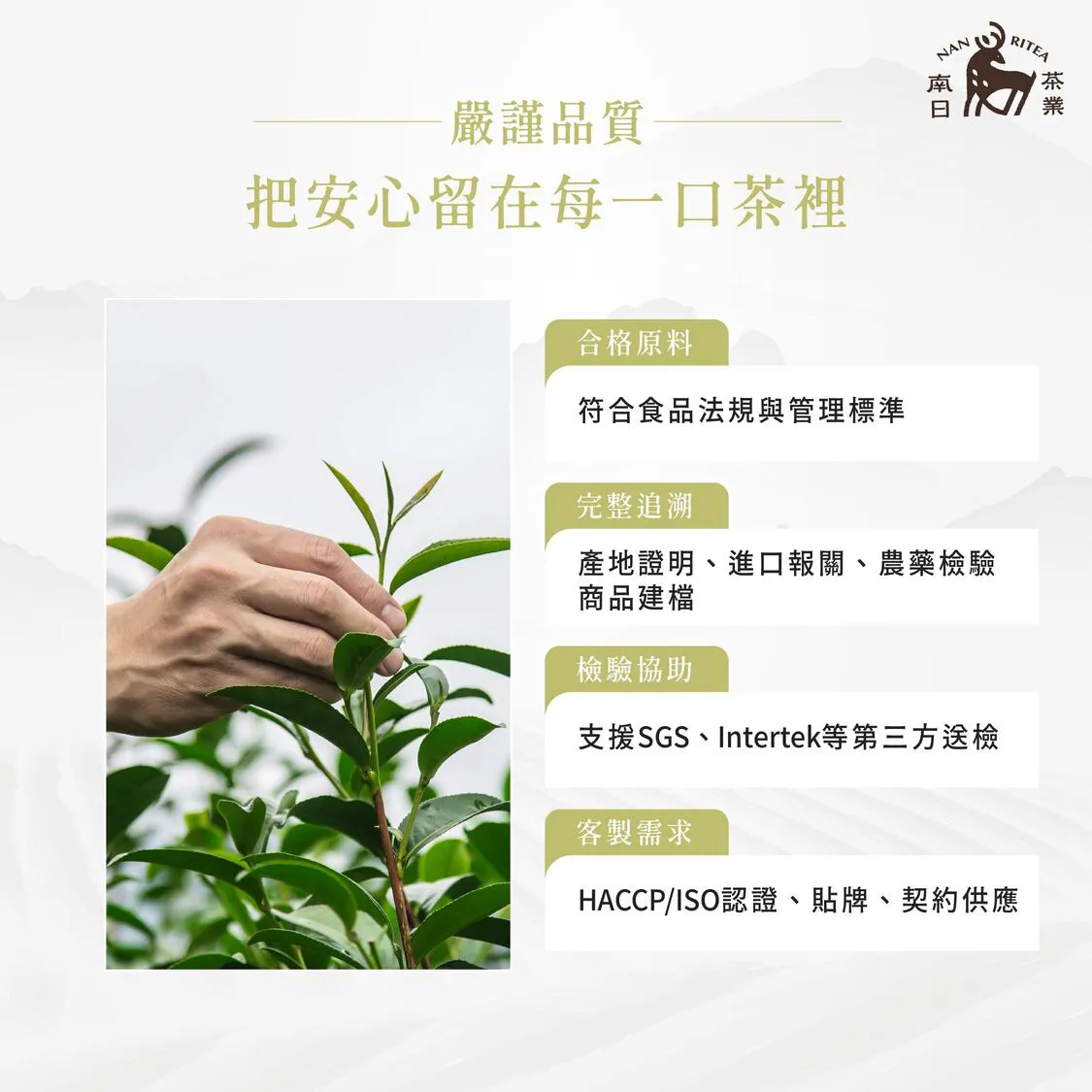 南日茶業專注於商用茶葉供應與茶底拼配,提供手搖飲、餐飲、加工廠、品牌客戶穩定、可大量採購的茶葉原料。我們主打: